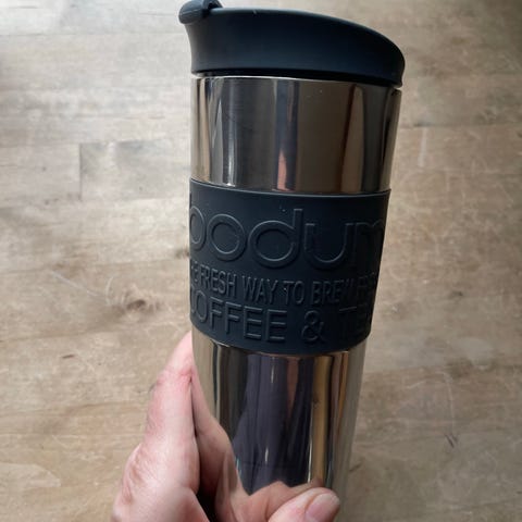 Bodum termokopp laget i rustfritt stål med svart silikon rundt for bedre grep. Egnet for varme og kalde drikker, designet for enkel transport og bruk.
