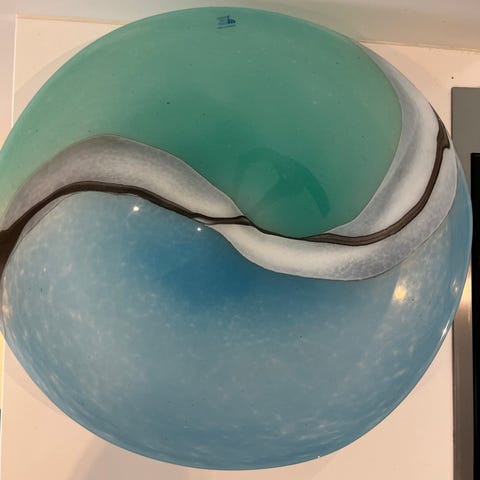 Munnblåst kunstglass fra Sinclair Sandefjord. De har organisk form og en nydelig blåturkis farge med mønster i hvitt.