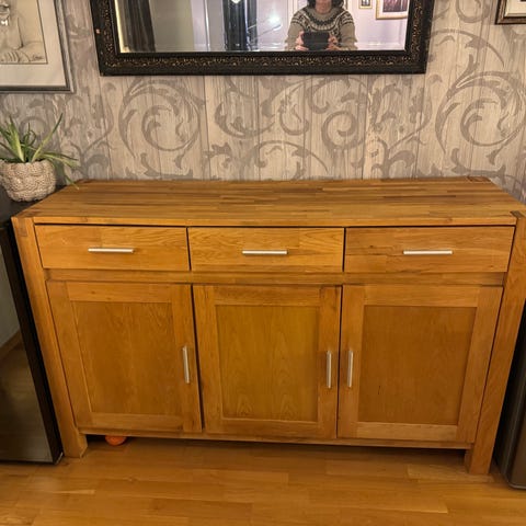Veggseksjon i heltre eik, 4 skap med matte glassdører, og fire skuffer. Mål: H204xB125xD34 og H83,5xB81,5xD34, total bredde 206,5. Ny pris ca. 30000, selges for 5000, må hentes.