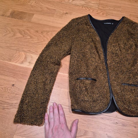 Flott dressjakke i linblanding fra MOGA of Norway. To dekorative «marmor»knapper i front, pyntebånd på ermene (ermene kan brettes ytterligere ned, så disse ikke synes) og to små stikklommer.