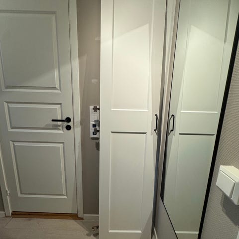 Veldig kjekt skap, med god plass til å henge klær. Er synlige merker, se bildet! Skapet selges da det ikke skal brukes lengre. Merkene synes ikke ved klær inni skapet.