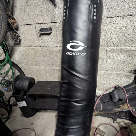 Hom com stående boksesekk i svart farge. Boksesekken er designet for trening og kampsport, med en solid base som gir stabilitet under bruk.
