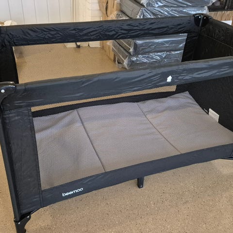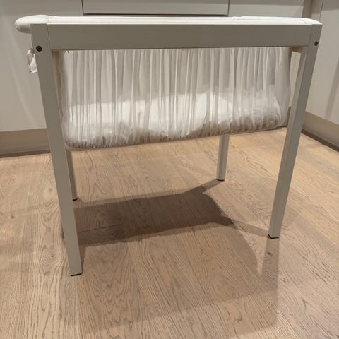 Smal og praktisk vugge fra Stokke. Perfekt å ha f.eks i stuen. Noen slitasjeskader (se bilder), men har ikke hatt betydning for bruken her i huset (kan nok også sys ganske lett)