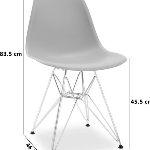 Eames stol grå, sittehøyde 44 cm, rygghøyde 83 cm. Små riper på ryggkant, se bilde 3 og 4. Må hentes i Oslo.