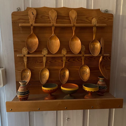 Treskjæring hylle laget i tre med utskjæringer og dekorative detaljer. Produktet har en naturlig trefarge og er designet for oppheng på vegg. Hylle har en tradisjonell stil med håndlaget utsmykning.