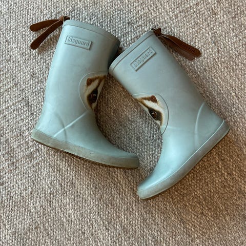 Bisgaard barn gummistøvler for unisex i størrelse 36. Gummistøvlene har en to-farget design med grønn og brun farge. De er pent brukt, kun et par ganger, men har mistet den éne skinnsnoren bak på støvelen.