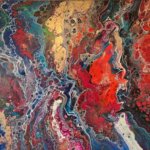 Abstrakt maleri med dominerende farger i blått, hvitt og gull. Maleriet viser en teksturert overflate med vertikale og horisontale fargestrøk. Passer til dekorasjon i ulike rom.