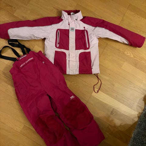 Helly Hansen vinterdress for jente i størrelse 134. Dressen er lilla med oransje detaljer og har forsterkninger på knærne. Passer til bruk i kalde værforhold.