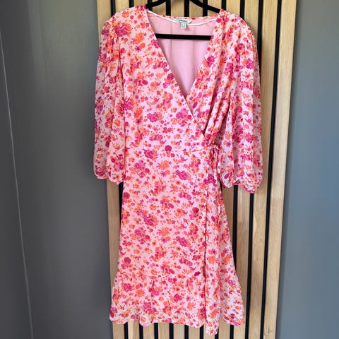 Omslagskjole i nydelig blåfarge med småblomstrete mønster. Belte i livet, så kan passe S-XL. Liten splitt nederst.