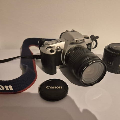 Selger et analogt speilreflekskamera Canon EOS 500 med Sigma UC Zoom 24–50mm f/4–5.6 objektiv.