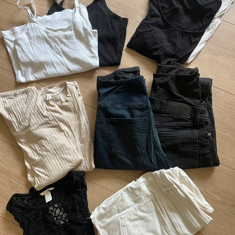 Stor pakke gravidklær selges med T-skjorter, bukser, shorts, gensere, singleter og kjoler. Det meste fra HM mama og i str M/S.
