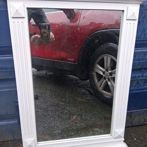 Solid ramme i tre. Noe maling som har flasset av og litt skavanker i malingen her og der som er fra naturlig slitasje da det er gammelt. Kan fint pusses og males. Ikke vært nok til at jeg har giddi å male det foreløpig 😊Vi har kun hatt det stående på gulvet men det kan festes på veggen. 113 cm høyt og 79 cm bredt.