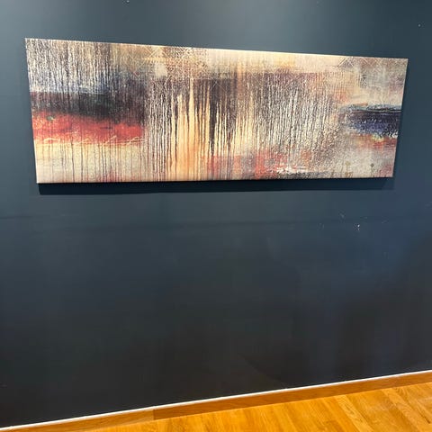 Abstrakt maleri med tekstur i grå, brune og svarte nyanser. Maleriet har en rektangulær form og viser et moderne uttrykk med lag på lag av maling. Egnet for dekorasjon i ulike rom.