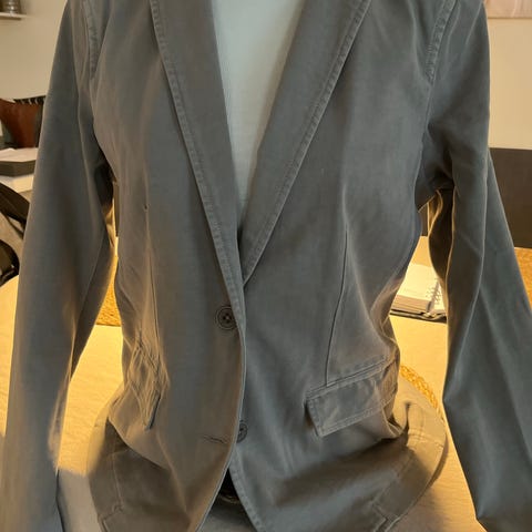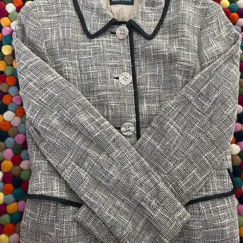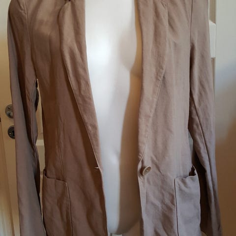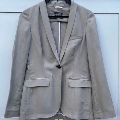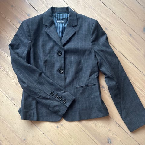 Marc O'Polo blazer for dame i størrelse M. Jakken er brun rutet. Den har et klassisk design med to knapper foran og lommer. Passer til formelle og uformelle anledninger.
