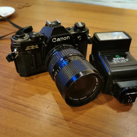 Blitz følger med: Canon Speedlite 177A, med original bag.