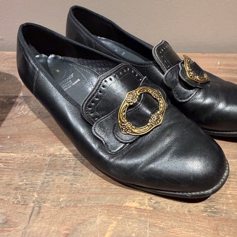 Pent brukte sorte bunadsko til herre, størrelse 12 (tilsvarer 46). Merke: Klaveness. Lær.