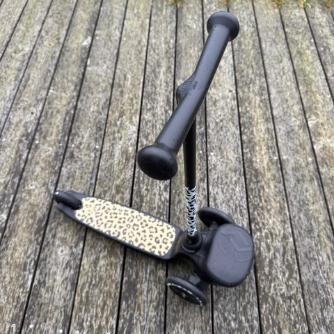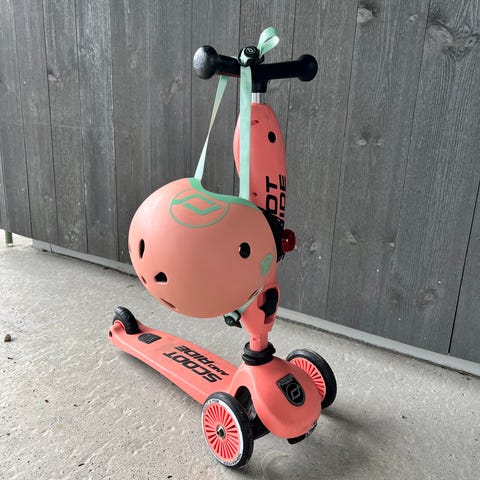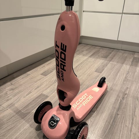 Scoot and Ride sparkesykkel i rosa farge. Designet med tre hjul for stabilitet og et sete som kan brukes for å sitte på. Egnet for barn. 1-5år