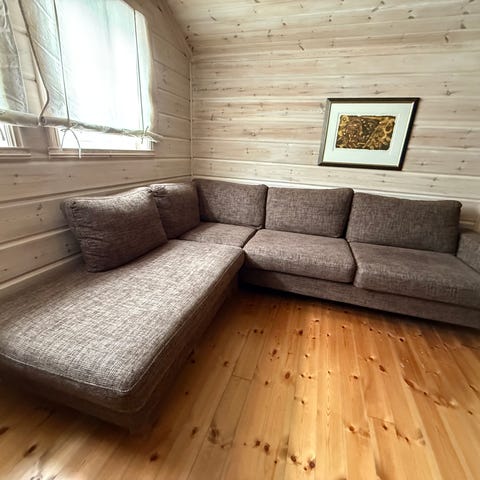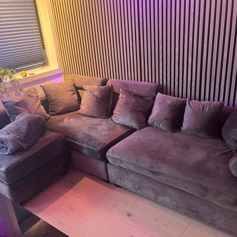 Fin og dyp sofa fra Burhéns i microsuede/mockaimitasjon. Kjøpt i 2021, men har stått på et ekstrarom, så den er fortsatt i fin stand. Målene er: