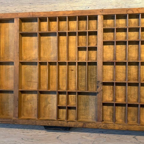 Settekasse fra gamle Ringerikes Blad. Flere rom, egnet for oppbevaring og organisering av små gjenstander. Platen har ulike størrelser på rommene, og kan brukes i hjem eller verksted for systematisk lagring.