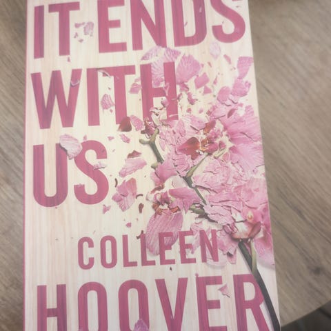 Colleen Hoover It Ends With Us bok med rosa og hvit dekor. Romanen er i standard bokformat, egnet for lesere som er interessert i samtidslitteratur.