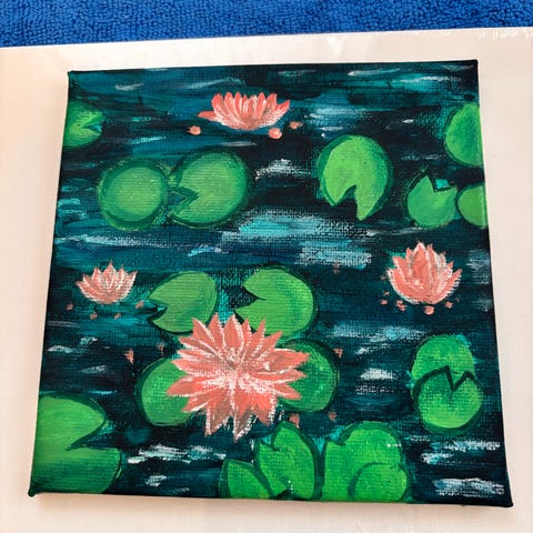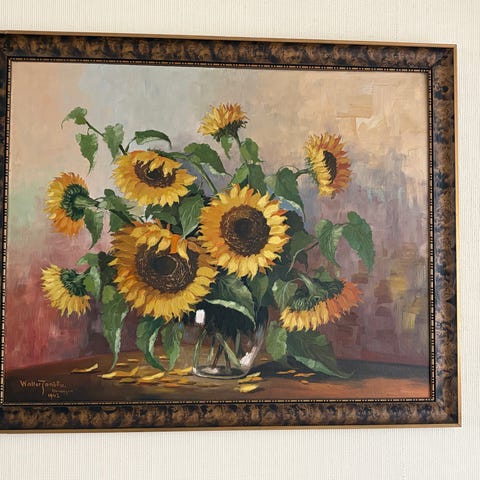 Albena maleri med motiv av blomster i vase og en skål med vannlilje. Maleriet har en mørk bakgrunn med varme jordfarger og detaljer i grønt og gult. Signert "Albena". Rammet inn i en enkel ramme. Passer til dekorasjon i hjem eller kontor.