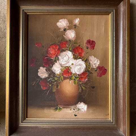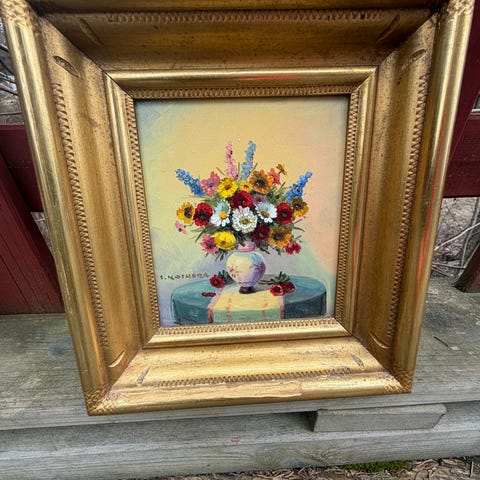 Oljemaleri som viser en bukett med solsikker i en vase, men kan ikke tyde signaturen. Maleriet er innrammet i en meget pen ramme i utskåret tre. Bilde er kjøpt i Haugesund på 70-80-tallet, men i god stand.