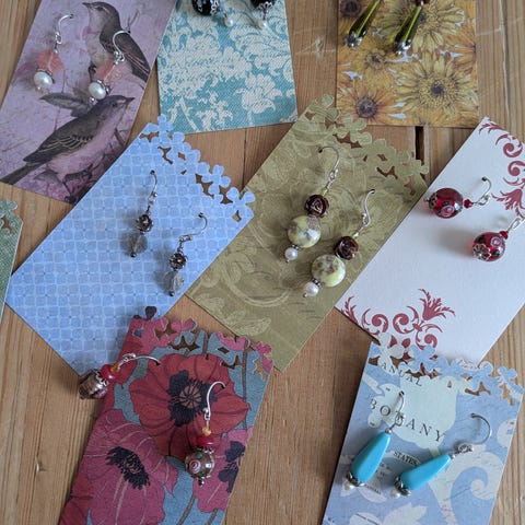 Selger helst samlet en samling av håndlaget øredobber jeg har laget selv med delikat, liten deler. Jeg har hatt god suksess selger dem på mange typer kunst og håndverk markeds her i Norge. Jeg selv har laget hvert stykke med høy kvalitet deler (f. Eks., krystaller, ferskvannsperler, ekte steiner, glass perler, forskellige metaller og ekte Sterling sølv ørekrokker). Alle komponenter var kjøpt i New York's motedistrikt i Manhattan.