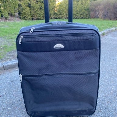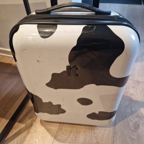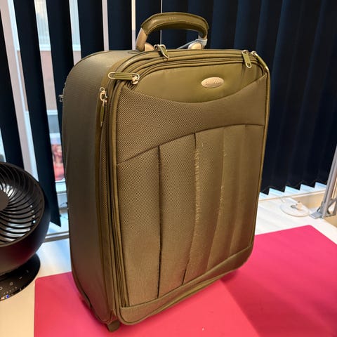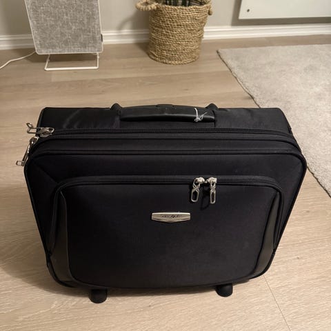 Samsonite trillekoffert. Laget av plastmateriale, egnet for reise og oppbevaring.