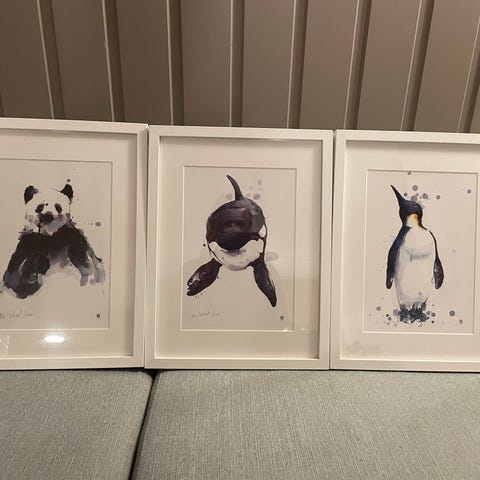 Innrammede Cecilie Sørgård plakater. Søte motiv med hund og isbjørn.