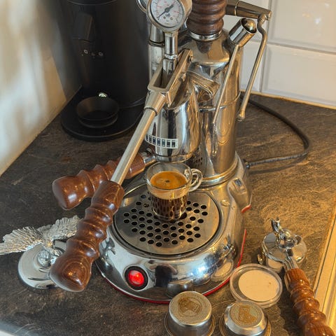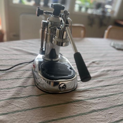 La Pavoni Professional 1,8 L.Espressomaskin i sølv. Maskinen har manuell betjening med spak, trykkmåler og avtagbar dryppskål. Egnet for tilberedning av espresso med finjustert kontroll over bryggeprosessen. Nettopp renover, perfekt fungerer maskin.