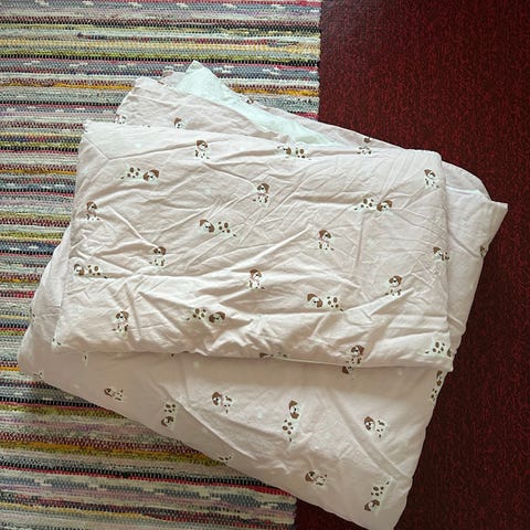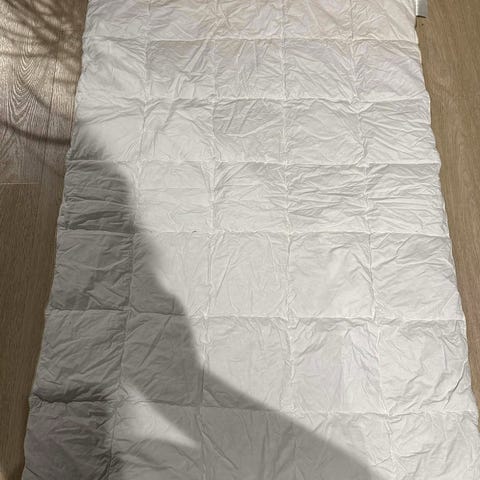 Juniordyne 100x140 cm og pute 40x60cm i dun fra Nordun. Brukt hos besteforeldre så det er lite og pent brukt. Ingen bruksmerker.
