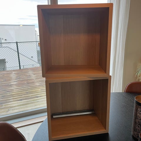 En todelt hylle i perfekt stand selges. Høyde 153 cm, bredde 76 cm, dybde 39 cm.