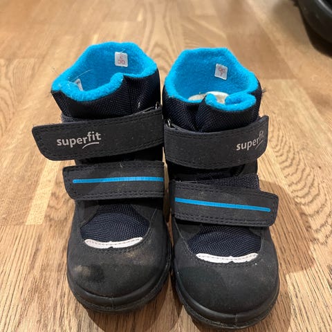 Superfit vintersko for barn, unisex, størrelse 23. Skoene er brune med borrelås for enkel justering. Yttersålen har mønster for grep, og innsiden er foret med mykt materiale for komfort.