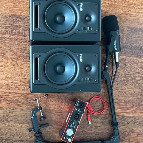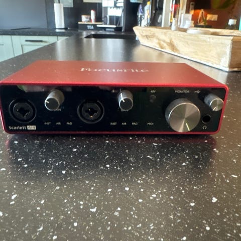 Selger Focusrite Scarlett 8i6 lydkort og Sennheiser MK4 mikrofon samlet.