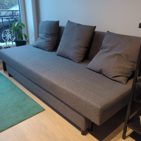 Mindre og praktisk pent brukt sovesofa. Er noen mindre bitemerker fra da hunden vår var valp, men disse er ikke synlige da de er på undersiden. Trekkene kan lett vaskes.