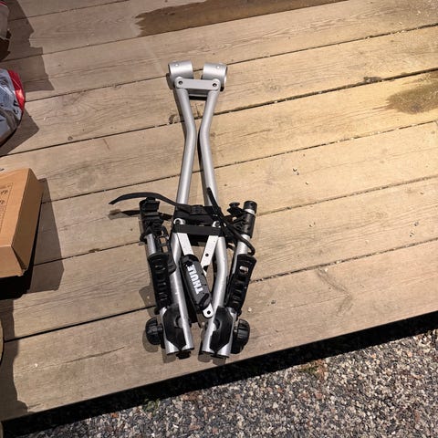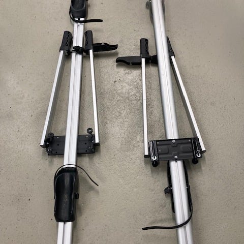 2 stk sykkelstativ i aluminium med låsemekanisme og nøkler selges samlet for 600 kroner. Designet for montering på bil for transport av sykler. Inkluderer festeklemmer og justerbare stropper for sikker lasting. Opprinnelig kjøpt på Biltema. Nypris var 500 kr per stativ (1000 kr totalt).
