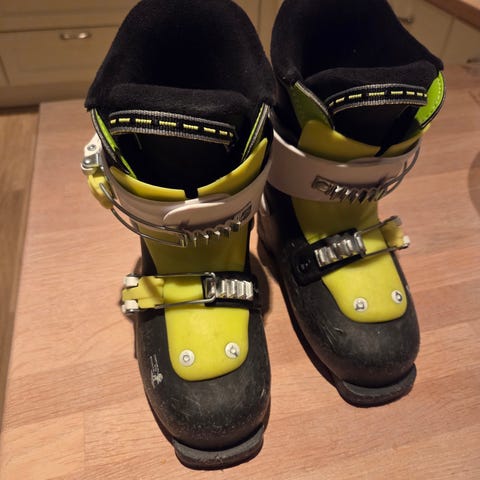 Godt brukte, men masse støvel igjen i disse to parene med alpinstøvler i størrelse 33-34, fargene svart og hvit. Støvlene har spenner for justering og hemper i innersålen. Perfekt for noen som skal lære seg, eller barn som vokser raskere enn du rekker å si «førstemann ned bakken» 😃