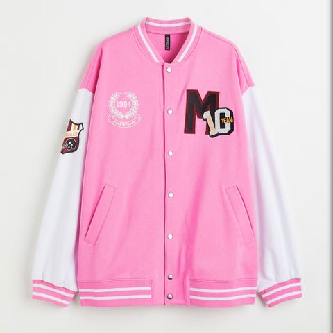 En baseballjakke med ribbestrikket krage, trykk-knapper foran og passpolerte lommer. Avslappet passform. Fôret.