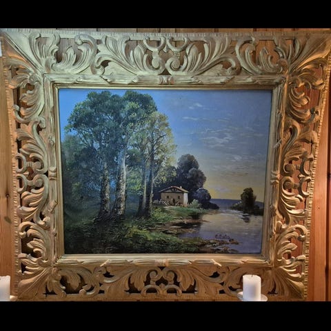 Oljemaleri med dekorative tre ramme, men jeg kan ikke tyde signaturen. Motivet viser naturlandskap med trær.