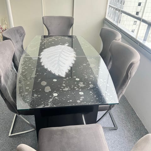 Spisebord med 6 tilhørende stoler til salgs. Et helhetlig bilde.