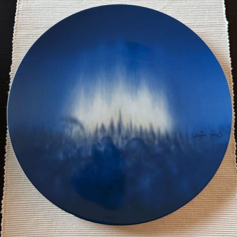 Magnor Utopia Sands håndlaget tallerken i blå farge. Tallerkenen er produsert i Norge og har et unikt design. Egnet for bruk som serverings- eller dekorasjonstallerken.