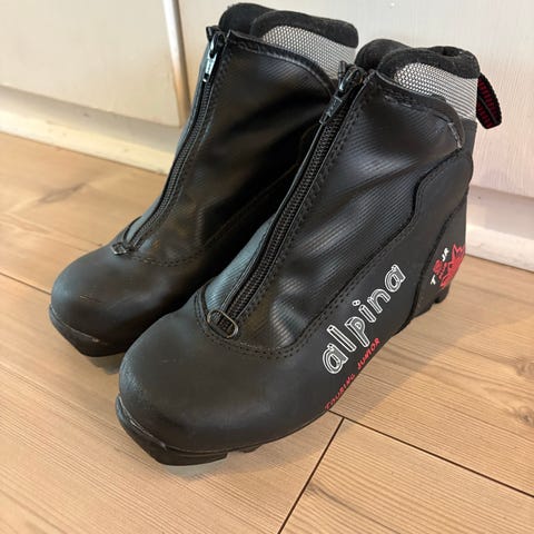 Alpina langrennssko storrelse 33, i fargene sort og sølv. Skoene har glidelås foran og er designet for langrenn.