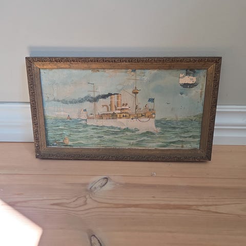 Håndkolert trykk, Freia av Stavanger skip, bygget i 1872 hos L. Smit & Zoon i Kinderdijk, Holland. Skipet var en fullriggert på 1642 tonn. Kjøpt av skipsreder A. Meling i Stavanger i 1904. Skipet forliste i Yarmouth i 1913 etter å ha vært i tjeneste med trelast. B: 48 CM H: 41 CM