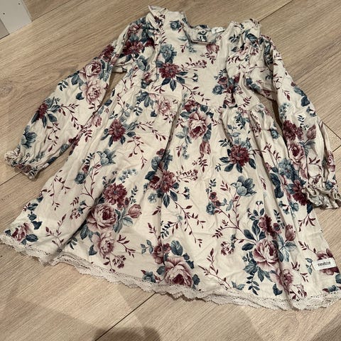 Nydelig Newbie kjole i størrelse 110. Kjolen er beige med blomsterprint. Bomullskjole. Pent brukt.