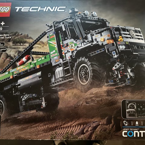 LEGO Technic 42147, lastebil byggesett med flere deler og instruksjonshefter for montering. Passer for barn fra 7 år og oppover. Inneholder plastdeler i ulike farger og former for å bygge en detaljert lastebilmodell.