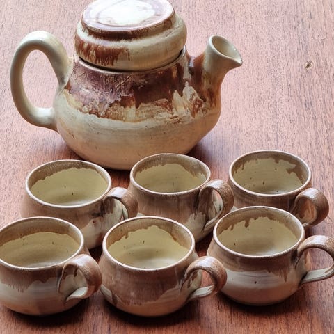 Sett med 5 blå keramiske vinglass. Glassene har en dekorativ design med stripete stilk og en buet form. Egnet for servering av vin eller andre drikkevarer.