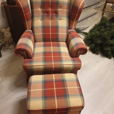 Meget pen ørelapp stol med skammel. Bevegelig rygg