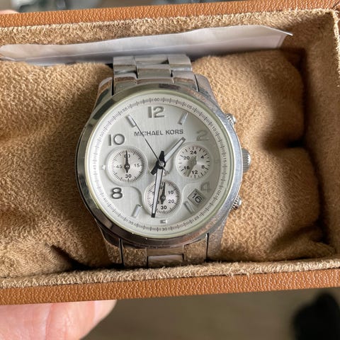 En original MICHAEL KORS-klokke kjøpt for noen år siden. Et nytt batteri ble installert i januar 2026. Håndleddets diameter er 17 cm. Min kone brukte den.