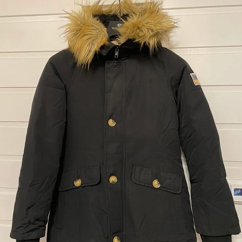 Svea Annet yttertøy for dame i størrelse XS, mørke blå farge, laget av dun. Jakken har hette med pelskant og er egnet som yttertøy i kaldere vær.