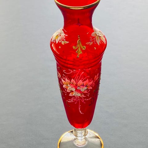 Superflott gammel Bohemian vase med sommerfugl i plantemotiv.